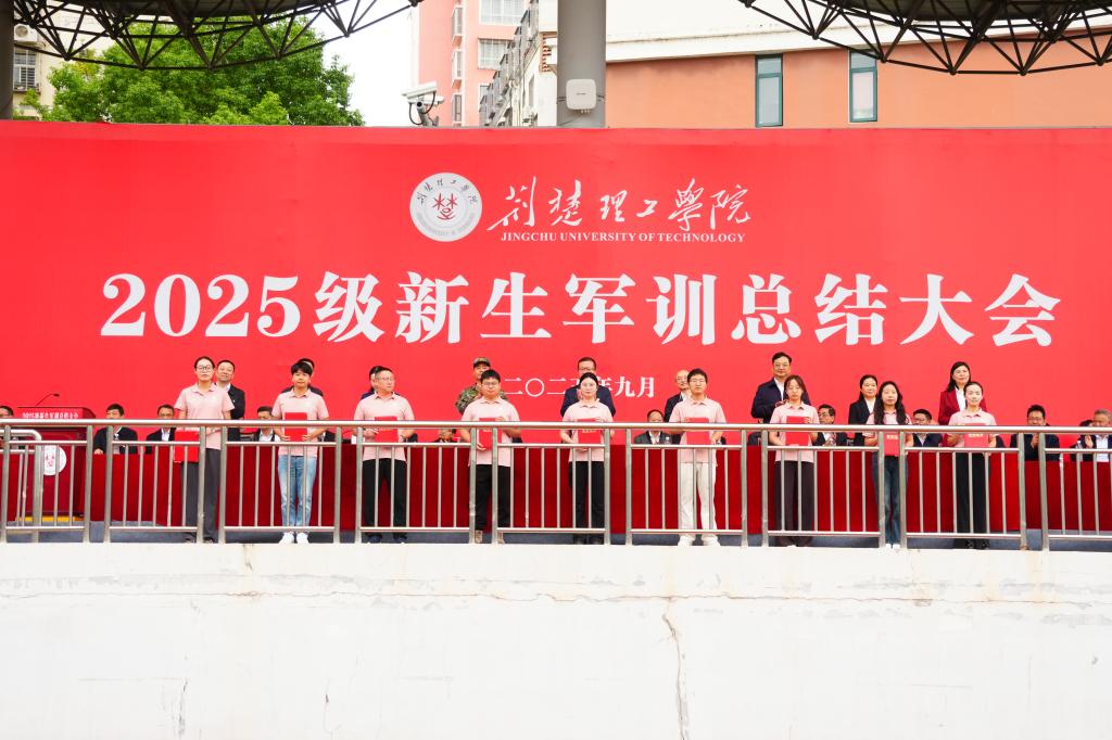 会上对2025级军训学生先进集体和先进个人进行表彰,并颁奖、授旗。优秀学员代表张必元同学、优秀指导员代表高芳佳发言,与大家分享了军训期间的成长感悟与收获。