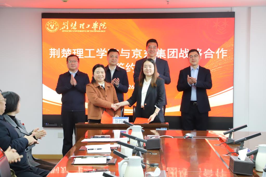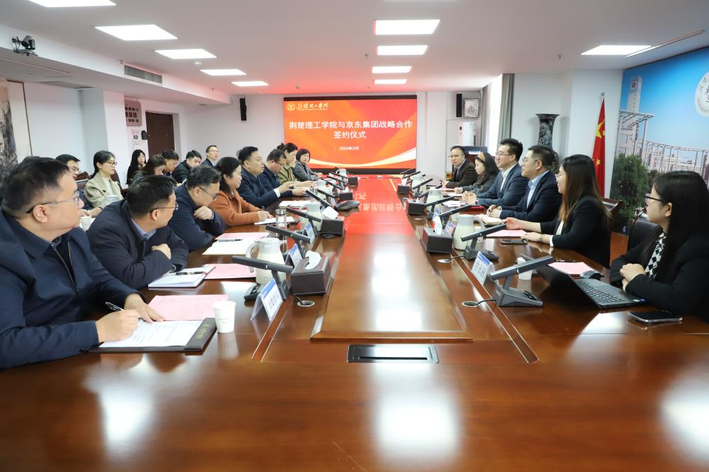 3月27日上午,我校与京东集团战略合作签约仪式在行政楼A406会议室举行。荆门市副市长高刃,市政府副秘书长王琴,京东集团人力资源副总裁、校企合作负责人陈鹏程,京东科技集团副总裁刘宇航,校党委书记武建斌、校长张友兵出席活动。副校长曹甜东主持签约仪式。